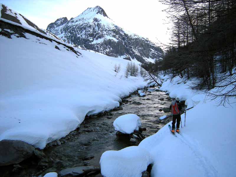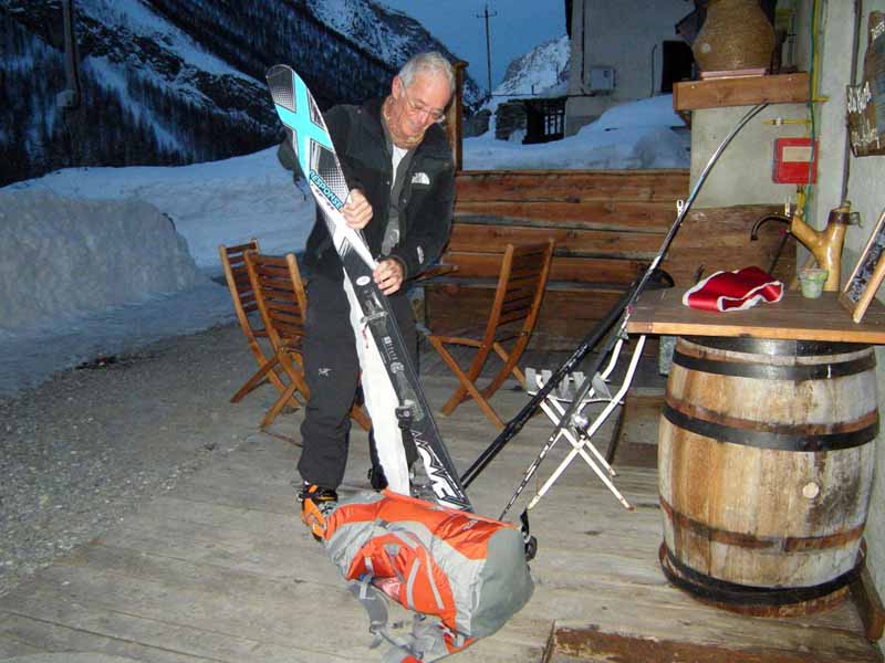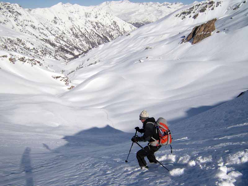 Weather and snow conditions were excellent for making a journey, but less than ideal for enjoyable ski descents. Almost a week of continuous warm weather and sunshine had consolidated the late February snowfall before we started. Ascents on south facing slopes were consistently firm in the morning, becoming soft by early afternoon. There were small pockets of better snow on steep north facing slopes, usually only found when descending from cols. We saw very few other skiers and there were more animal tracks (chamois, hare, fox) than ski tracks in the snow.