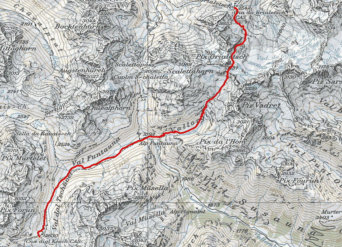 Notes: Descend Val dal Tschuvel and Val Funtauna to Alp Funtauna 2192m. Climb Vallorgia northwards towards Pix Grialetsch. The simplest route crosses Fuorcla Vallorgia 2967m rather than the higher pass slightly further north shown on the Swiss maps. It is debatable whether it is best to traverse into the hut from approx 2700m, or descend to approx 2300m NE of the hut and then reascend 250m over approx 1km, heading SW.
