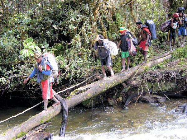 Most of the afternoon was taken up by multiple porter negotiations which our local guide Jimmy attended to with rising exasperation. The problems were complex but the solutions all seemed to require Jimmy paying out more money to an ever growing list of people. We began to appreciate why climbing Carstensz is such a problematic and expensive proposition. The following morning we aimed to start trekking early to beat the afternoon heat, however more 'discussions' about money delayed the start until 11.00 when we finally got underway with an entourage porters. We had hired 30 men, but several of these had brought along friends and relatives to help. We ended up with more than 40 people including 3 women, a teenage girl and a baby! A reasonable path led through scattered settlements where people farmed small scale plantations on steep hillsides in patches where the forest had been cleared. Soon after reaching our overnight stop at the last village, the heavens opened and we were treated to a dramatic tropical downpour. After our first day of trekking the team were in good spirits: we had avoided trekking in the rain and had not seen any of the terrible mud we had been warned about. Perhaps trekking to Base Camp was going to be easier than we had been led to believe?