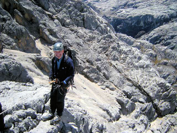 Alarms sounded at 12.30 and the team assembled for breakfast at 01.00. An hour later we left Base Camp, reaching the start of the climb at 03.00. It had been damp and a little misty as we left BC, but by the time we started to climb the rain had was falling in earnest. The lower part of the route follows a series of corner systems up a steep limestone wall. As we climbed the fixed ropes in the dark the rainfall increased and water began to run down the rockface. Before long we were climbing a waterfall. A little above halfway the face was broken by a large, gravel filled amphitheatre. Entering this we escaped from the running water, but a sudden drop in air temperature caused the rain to change into snow. As the first rays of dawn began to illuminate the mountain we continued upwards feeling cold and wet, and wondering if we were doing the right thing. We reached the crest of the ridge around 06.00 just as the snow shower ended. The weather then improved enabling us to climb the final section of the route in better conditions. The sun even came out to dry our wet clothes. Once on the ridge we had to cover 500m of horizontal distance with a height gain of about 100m to reach the summit. Most of the terrain was straightforward, but there were three deep notches or gaps in the ridge to overcome. The first was by far the largest, and posed the biggest problem. In the past people have abseiled into this gap and either climbed or 'jumared' up the other side. In recent years a series of ropes have been fixed across the gap enabling climbers to swing across in a move known as a 'Tyrolean Traverse'. Connecting the climbers to this rope line and assisting each person in turn to cross to the other side of the gap was a time consuming process, but had the advantage of giving the climbers time to rest and enjoy a snack while waiting for their turn on the rope.
