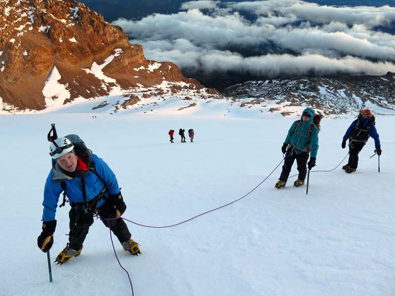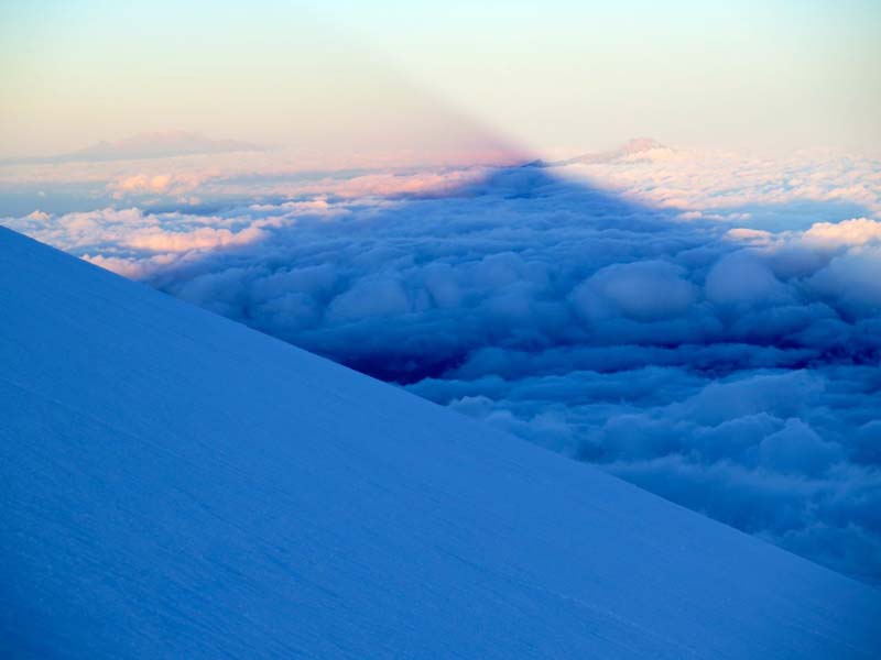 The ascent of Izta was a long day as the route joins the summit ridge some distance from the top and passes over (up and down!) several subsidiary summits on the way to the highest point. From the campsite to the top is 6.1km with almost 1,000m of ascent. We awoke at 02.00 and started out at 03.00. Climbing in the dark we reached the ridgeline by 04.00 and had completed the steepest section reaching 5000m by 06.00. We crossed a wide, level glacier as dawn broke and we saw the sun rise in the east. By the time it was light at 07.00 we could see the summit a short distance ahead of us. The first members of the group were on top 10 minutes before the others and by 08.00 all 10 climbers and 5 guides were on the summit for a team picture. On the descent we were able to appreciate the spectacular views from the long ridge that we has ascended in the darkness.  Nearby Popocatepetl had been smoking gently all morning but released a large puff of smoke and ash as we watched.
