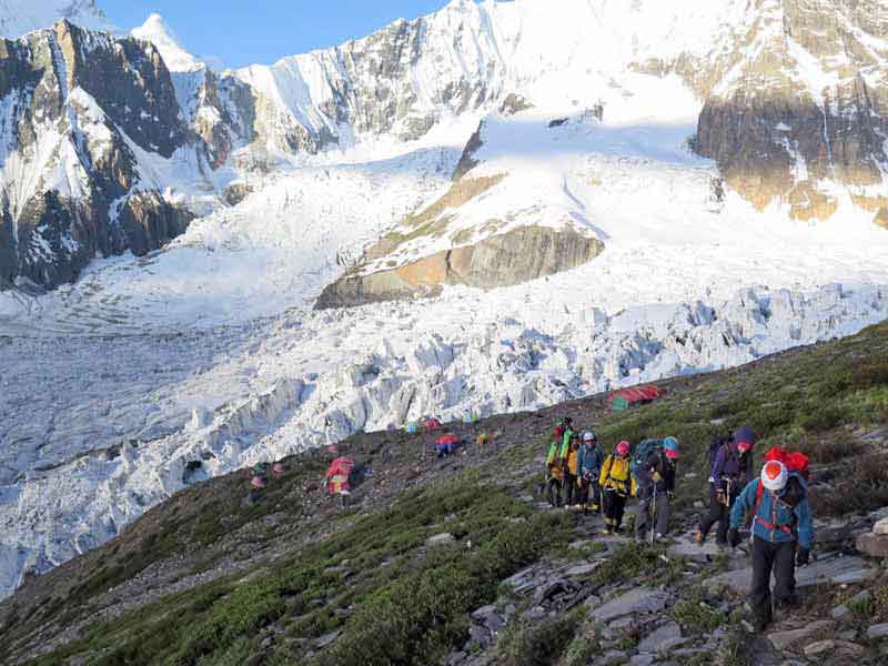 After taking some pictures we hurriedly set off for Camp 3 anxious to beat the rapidly rising heat and softening snow. Conditions became unbearably hot as we approached Camp 3 at 14.00. The snow was too soft to descend any further so we all spent a second night at Camp 3. The forecast for the following day was good, but overnight snow continued to fall until mid morning and delayed our intended dawn start. We finally left Camp 3 in a brief weather clearing at 07.45 taking 3 hours to reach Camp 2. The local staff did a heroic job removing all the fixed rope and anchors and bringing this to Camp 2. We then set off together taking another 3 hours to reach Camp 1 in cloudy conditions and softening snow.