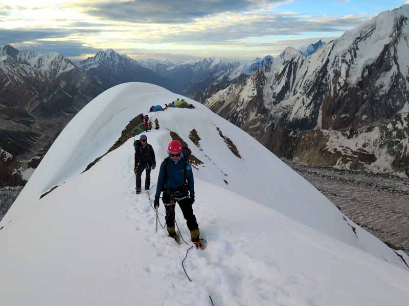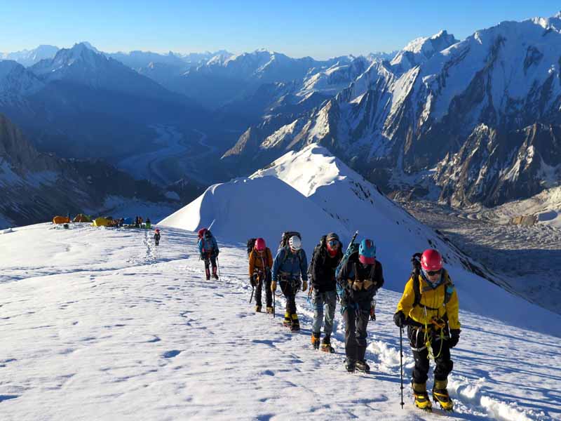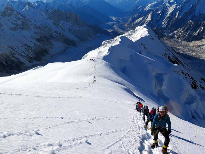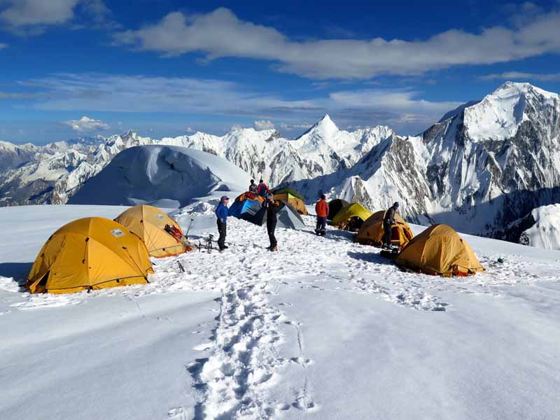With supplies and tents already in place at Camp 2 (5680m) the whole team left BC on 15th July and spent the night in Camp 1. The following day we all climbed to Camp 2. The freezing level was a bit higher than we would have wished, but the journey to Camp 2 was not too bad and snow conditions were reasonable. The team enjoyed a rest day on 17th July while the local staff placed approx 1000m of fixed rope on the steep ground between Camp 2 and Camp 3 in hot sunshine. Conditions were again hot and sunny the next day when the team climbed to Camp 3 (6280m). Leaving Camp 2 at 05.30 in the morning enabled us to miss the worst of the heat, although the snow was already soft by 10.30 when we reached Camp 3.