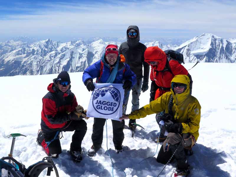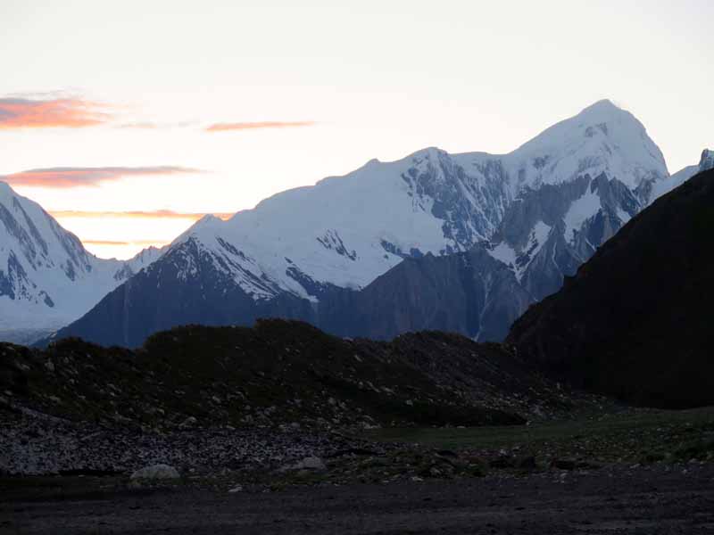 19th July was summit day. Leaving Camp 3 at midnight conditions were cold and clear. For the first time in the entire climb a there was a fairly strong wind blowing and this continued throughout the ascent. Temperatures were not much below zero but the 20-30 knot winds made it feel much colder. The snow surface had not fully frozen and with each step we punched 10-20cm through a breakable crust. The combination of strong winds and crusty snow slowed progress and together added a few hours to the ascent. By the time of first light at 04.00 we had crossed a wide plateau and started onto the steeper ground of the South Ridge. As the light improved it was possible to see down to the glaciers of the Hunza region to the west and make out the deep valley of the Karakoram Highway. After a few hundred meters of 30° climbing the angle eased and the snow slope gave way to a broad ridge of rocks and snow patches. The wind eased slightly and we reached the large level summit expanse about 10.00. Two of the party had turned back a few hours before with two of the local staff, so the summit team comprised 2 guides, 3 climbers and 3 local staff.