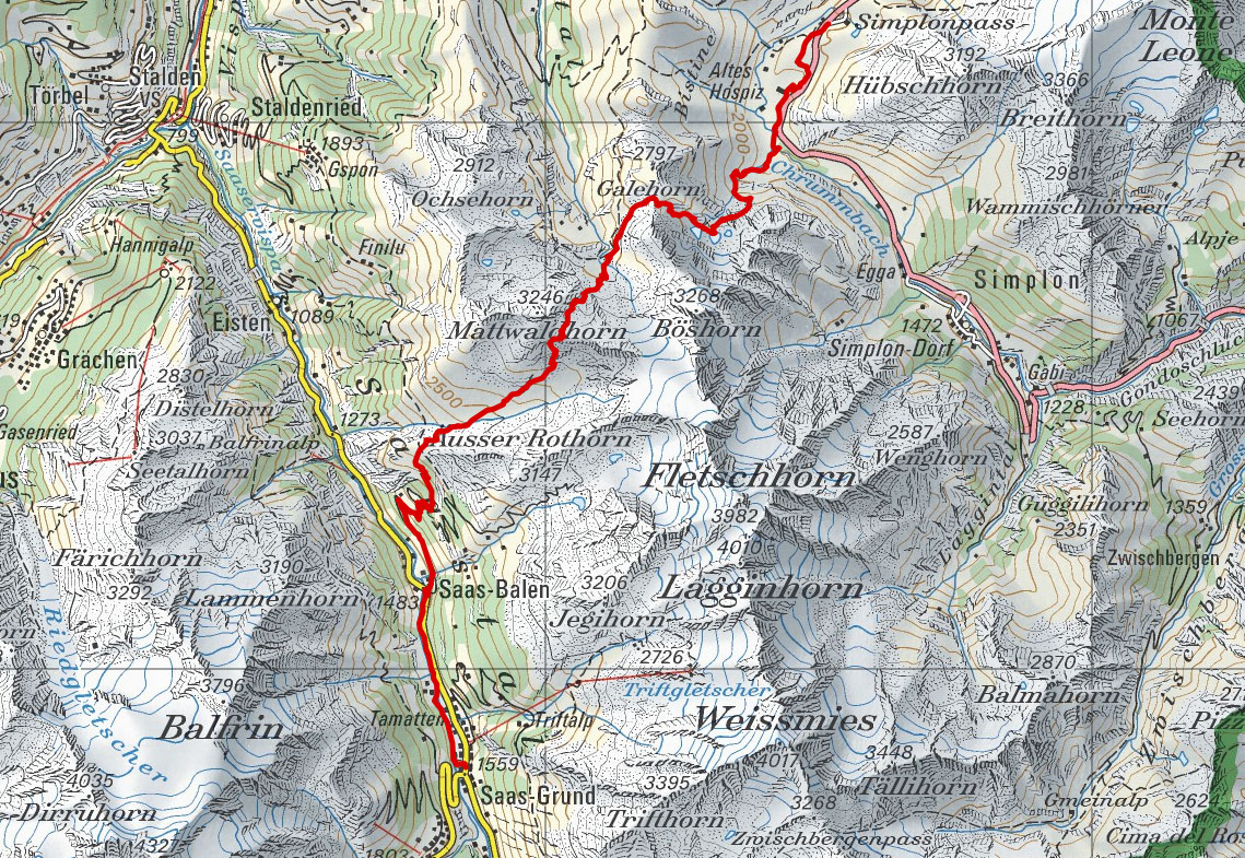 Notes: This is excellent and varied day crossing two high passes. Follow the Nordic ski tracks down the valley to Saas Balen than take a forest road heading due north. Around 2200m turn east into Mattroaldbach until approx 2600m then turn north towards Simelipass 3022m. Descend NE to approx 2500m then climb to Sirrooltesattel 2621m. Descend to the road at Nideralp 1825m and ski north along the broad valley to Simplonpass.