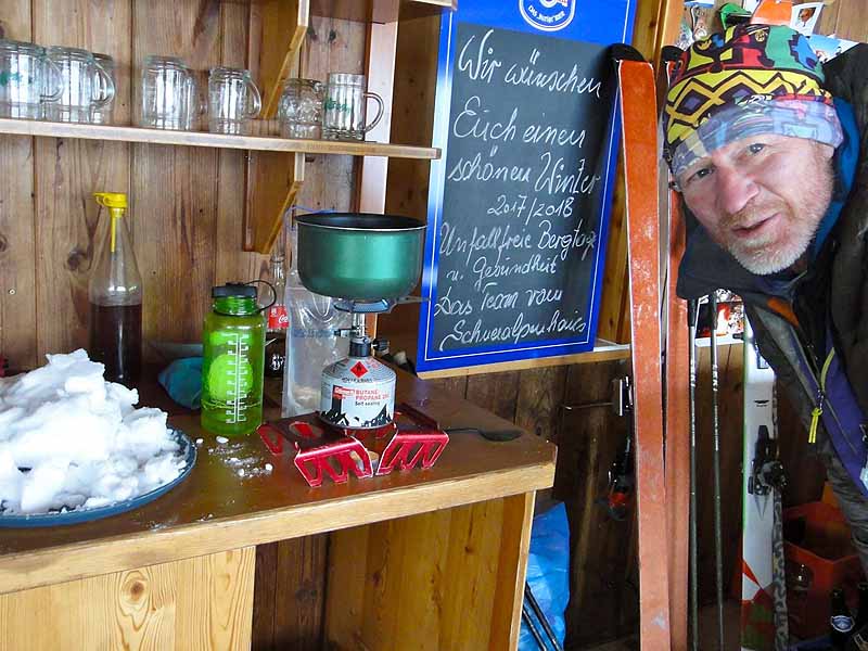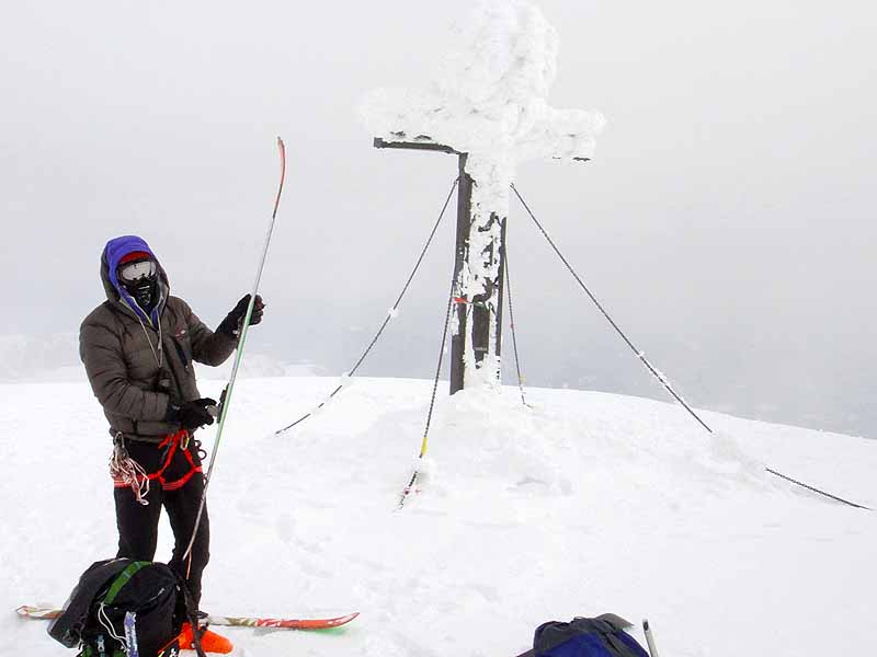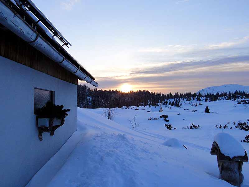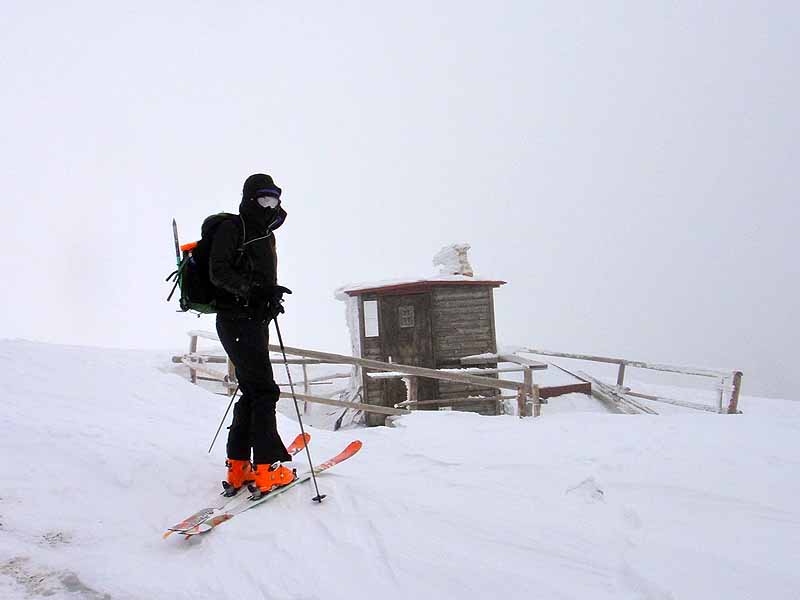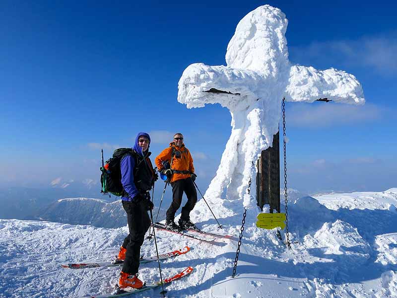 The second part is distinctly more mountainous, traversing five high limestone massifs, each with multiple summits: Hochschwab (2277m), Veitschalpe (1981m), Schneealpe (1903m), Raxalpe (2007m), and Schneeberg (2076m). This would be considered a substantial tour anywhere in the Alps. Four out of the six travel days took nine hours or longer. There was plenty of deep snow in the forested approaches to the peaks but the summits were often wind blasted and coated in rime ice. We encountered a lot of poor weather including strong winds and temperatures below -25°C. During this stage we had two very cold overnight stops: a bivouac in an outbuilding next to the Sonnschienhütte (which had unexpectedly closed after telling us they would be open), and a night sleeping on the dining room tables in the Schneealpenhaus, a hut not set up for winter visitors. In both cases our food and water froze inside the buildings and it was necessary to light candles under the gas stove before it would operate.
