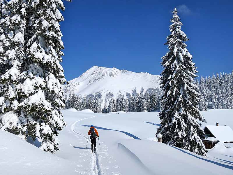 The team for the 2018 leg was David Hamilton and Steve Kentish, with Claire Marvin driving a support vehicle. We started in Großsölk in the Schladming valley and travelled northeast through the province of Steiermark to the eastern extremity of the alpine chain on the banks of the river Danube. This is not a region frequented by British skiers or those making multi-day ski tours, but there are numerous day tours popular with locally based Austrians and on some days we met a few other skiers. The tour divides naturally into three distinct sections.