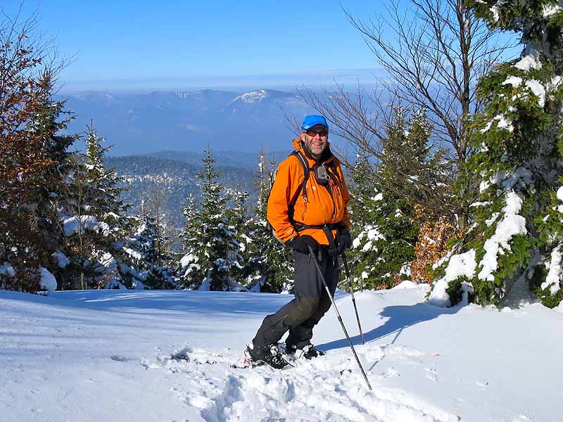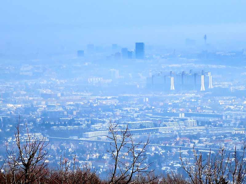 The third section leaves the high mountains behind and traverses the undulating hills of the 'Vienna woods' gradually losing height until it reaches the city limits. At the planning stage we had assumed that it would be necessary to hike much of this without skis. However the excellent snow cover enabled us to ski on a combination of footpaths and forest access roads for almost the entire distance. In four days we covered 95km and climbed 2722m. From the small resort town of Puchberg at the foot of the Schneeberg we followed the forested ridge of the Dürre Wand (1222m) to Pernitz. The following day was shorter, taking in the summit of Waxeneck (785m) on the way to Pottenstein. The next day was similar in character, taking in the summit of the Hoher Lindkogel (834m) on the way to Gaaden. The final day was split between a morning on skis and an afternoon on foot. We skied through woods to the Kammersteinerhütte (582m) and climbed the historic Josefswarte Tower for our first view of the city below. A short ski descent led to vineyards on the edge of Vienna where we packed the skis and walked the final 15km to Stephansplatz in the city centre.