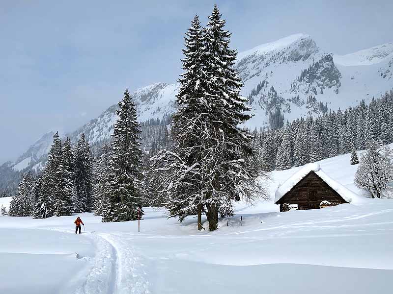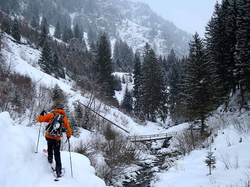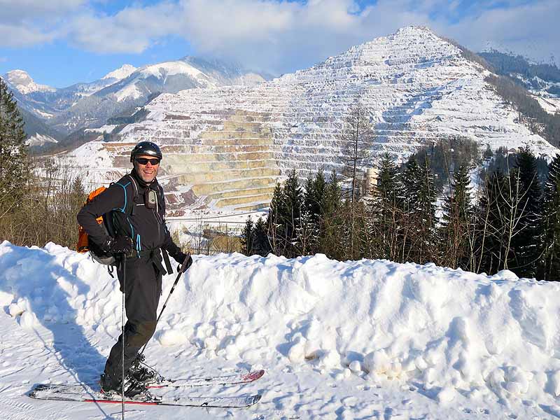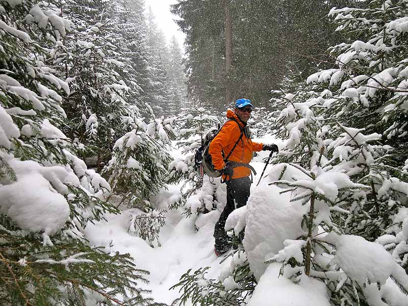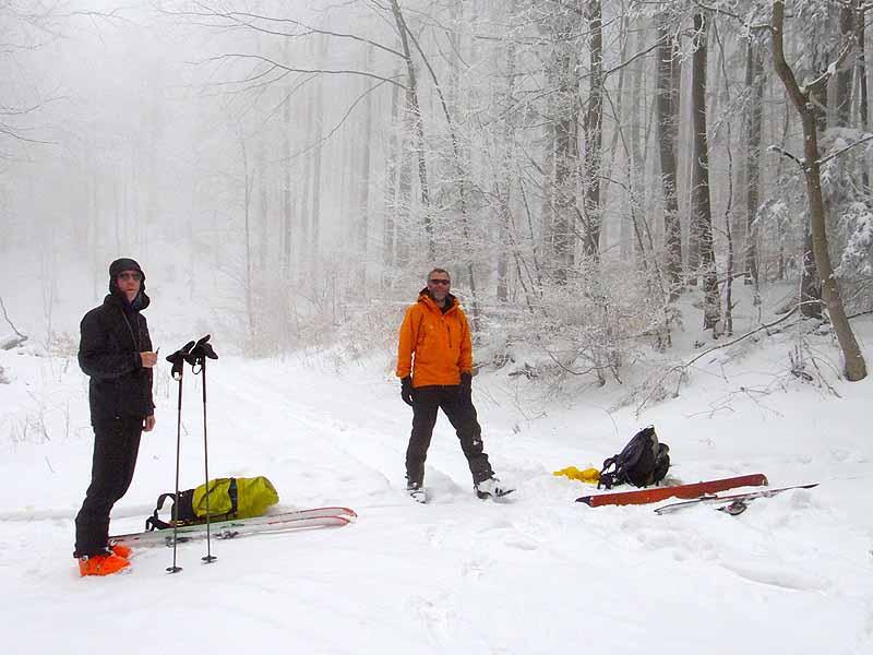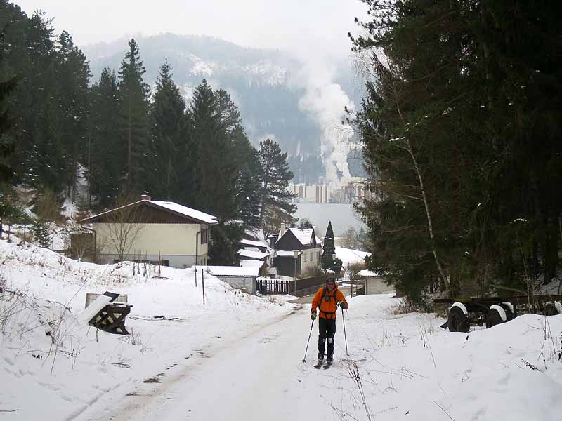 The first part exits the Niedere Tauern and travels through a predominantly forested landscape to the mining town of Eisenerz. This was a six day journey with overnight stops in Donnersbachwald, Gulling, Rottenmann, Johnsbach, and Radmer. These are similar days, each with some road walking, a mixture of forest trails and footpaths, and some good ski terrain. The summer hiking trails are generally well marked but a GPS is essential for winter navigation. The forest access roads enabled fast and efficient travel while the narrow and indistinct footpaths could be frustratingly difficult to follow. On the first day we climbed to the summit of the Großes Bärneck (2071m). On following days we were satisfied to cross obvious passes linking the various valley systems. The weather was not great and we saw very little sun. However the visibility was just good enough to navigate the largely non-technical terrain.